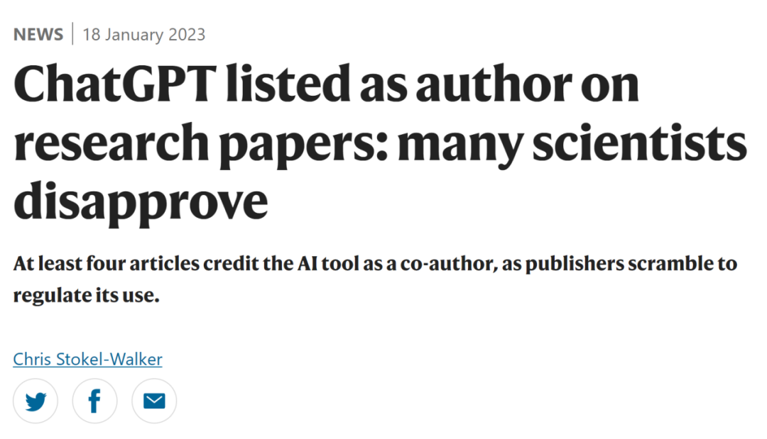 2.Chris Stokel-Walker. ChatGPT listed as author on research papers: many scientists disapprove. Nature 613, 620-621 (2023)