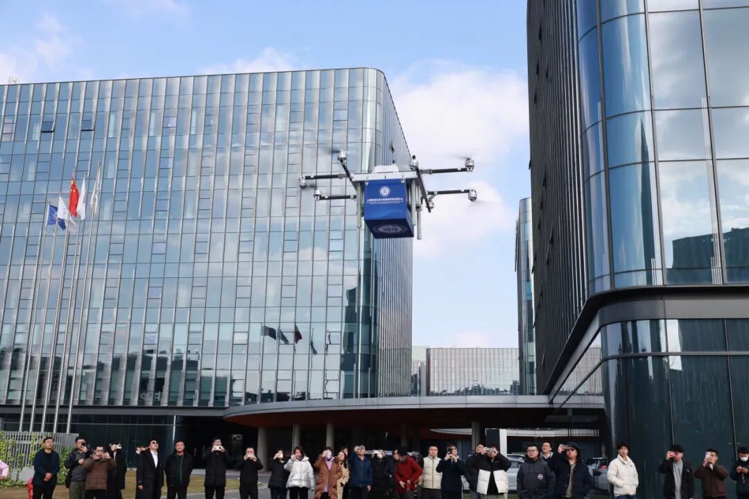 正式课程开始前,在中心搭建的无人机临时起降点上,中心低空智联技术研发中心杨辉现场操作,无人机在全场观众的见证下顺利起飞,从北大临港科创中心大楼(浦东新区海洋二路88弄)沿规划航线飞至港城新天地(浦东新区茉莉路225弄),第三方导航显示地面距离约5公里。