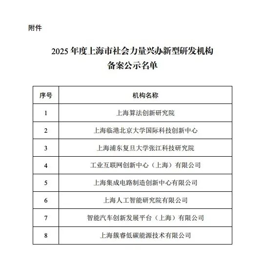 近日,上海市科学技术委员会发布《关于2025年度上海市社会力量兴办新型研发机构备案结果的公示》,此次公示8家单位,上海临港北京大学国际科技创新中心(下称“北大临港科创中心”或“中心”)获得上海市新型研发机构资质。