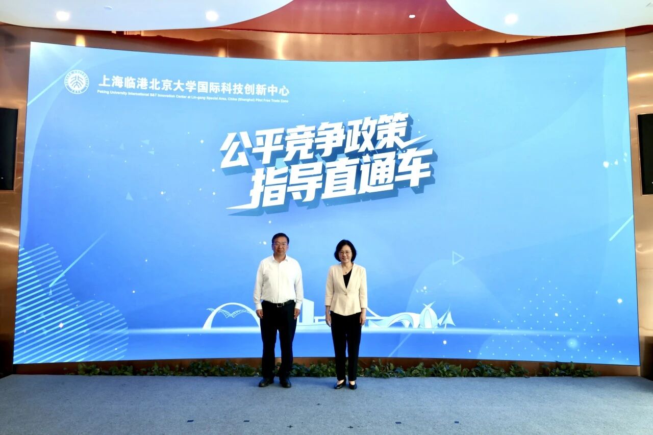 上海市市场监管局党组成员、副局长、一级巡视员彭文皓,临港新片区党工委委员、管委会专职副主任赵义怀共同为上海市首个“公平竞争政策指导直通车”——“北大临港科创中心公平竞争政策指导直通车”揭牌。