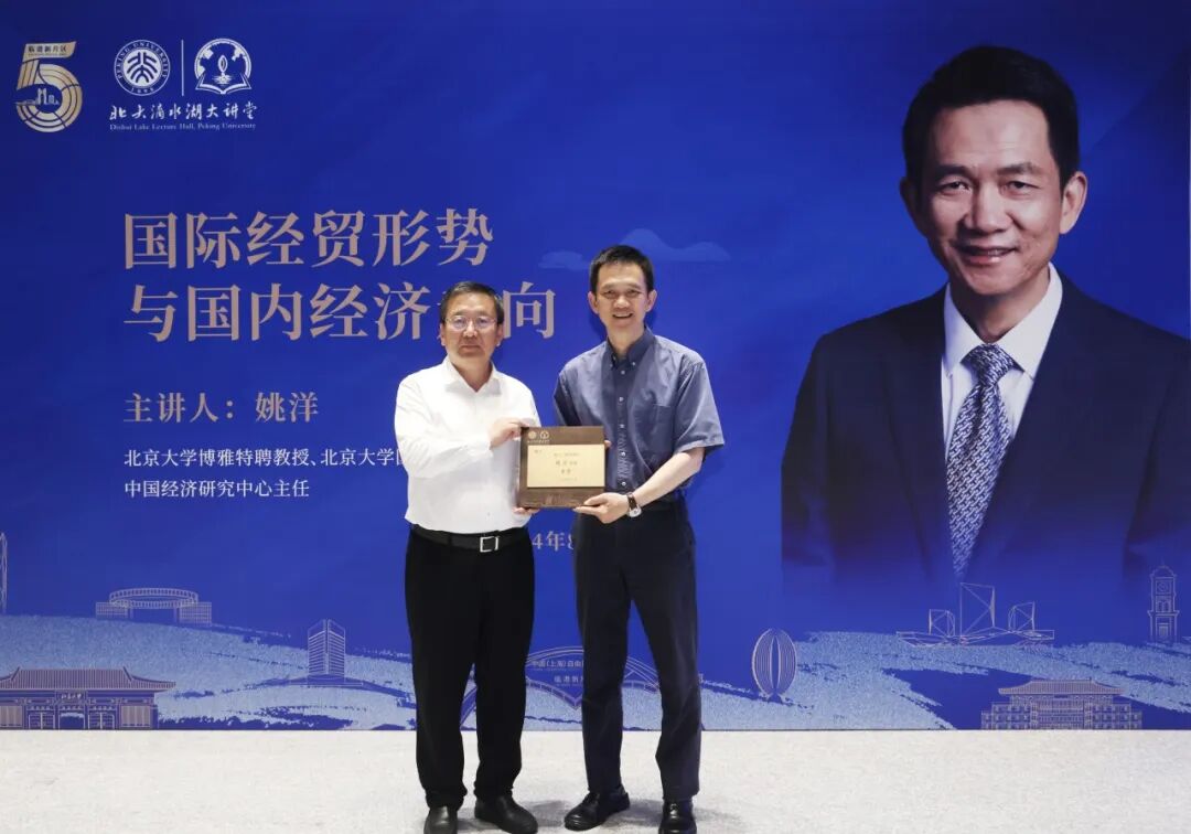 Before the event, Zhao Yihuai, Member of the Party working committee of Lin-gang Special Area and Deputy Director of Lin-gang Special Area Administration warmly welcomed Prof. Yao Yang and presented him with a commemorative plaque as the 13th lecturer of PKU-DSLLH.