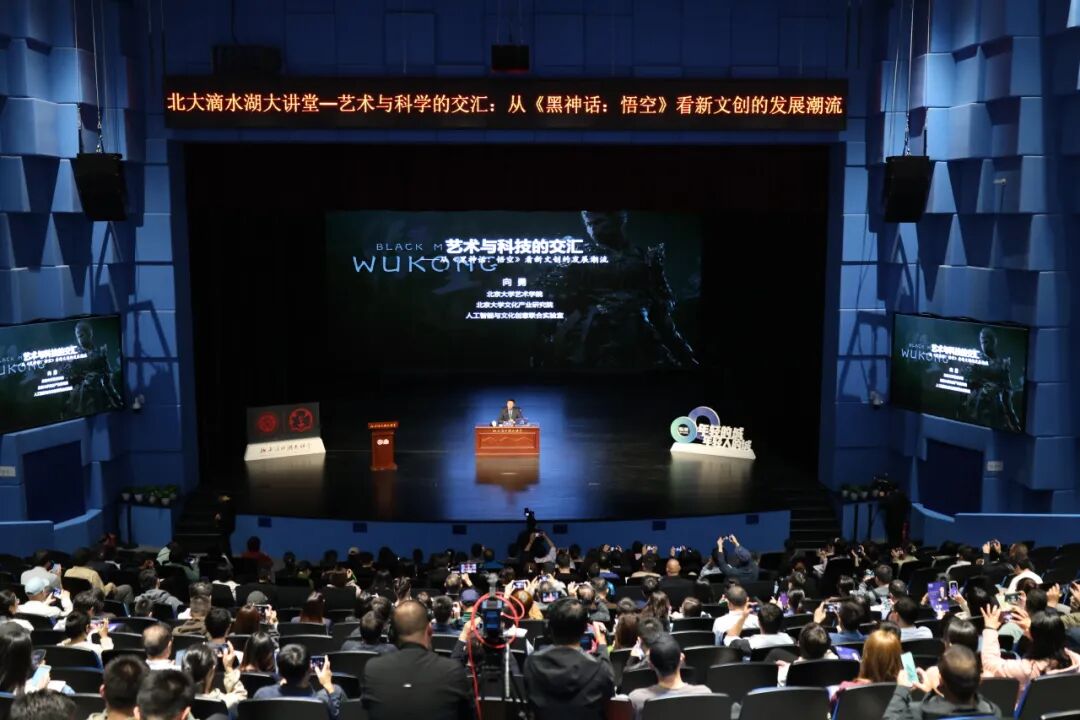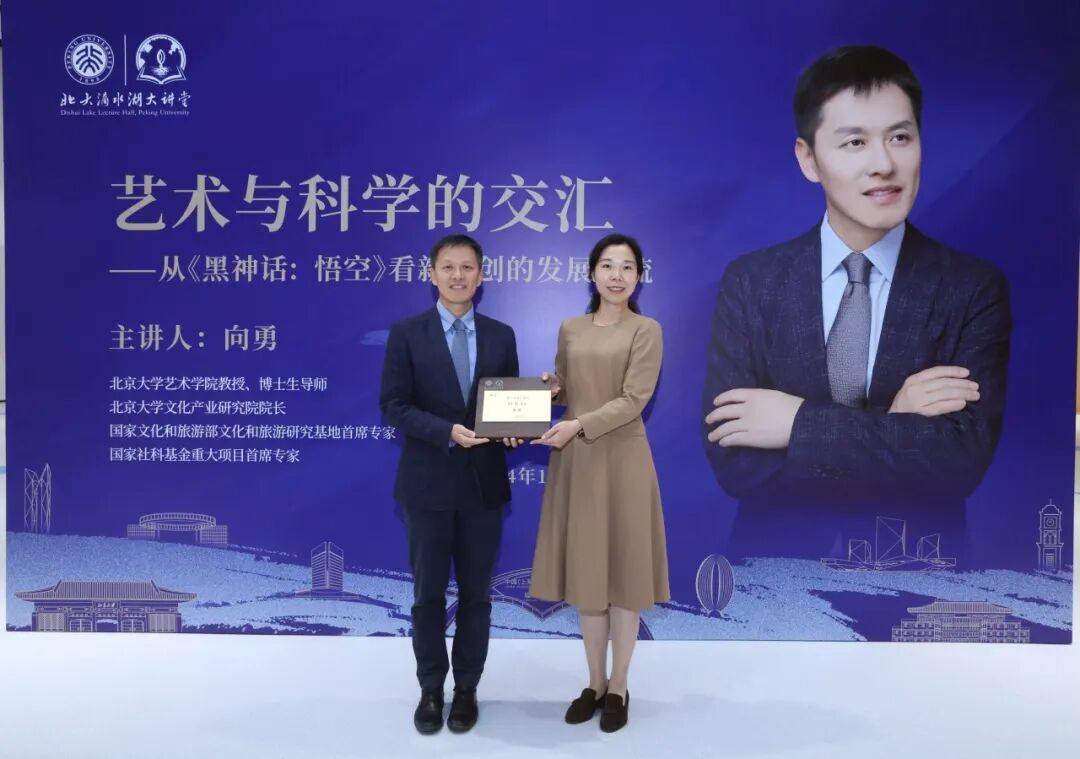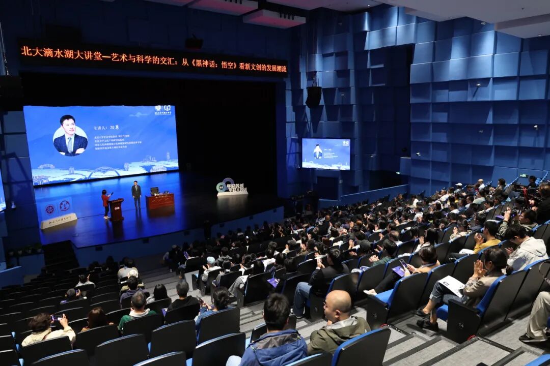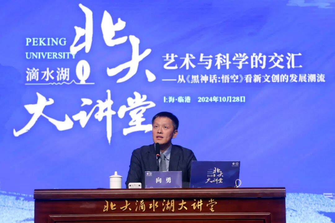 On the evening of October 28, 2024, the 15th lecture of Peking University Dishui Lake Lecture Hall (PKU-DSLLH) was successfully held. Professor Xiang Yong, a doctoral supervisor of the School of Arts, Peking University, and Dean of the Institute of Cultural Industry, Peking University, was invited to give a lecture titled Where Art and Science Meet — Exploring the Trend of New Cultural and Creative Products through “Black Myth: Wukong”(《艺术与科学的交汇——从〈黑神话:悟空〉看新文创的发展潮流》). This lecture took place at the Lin-gang Children's Palace and opened a mental journey of how art and science integrate.