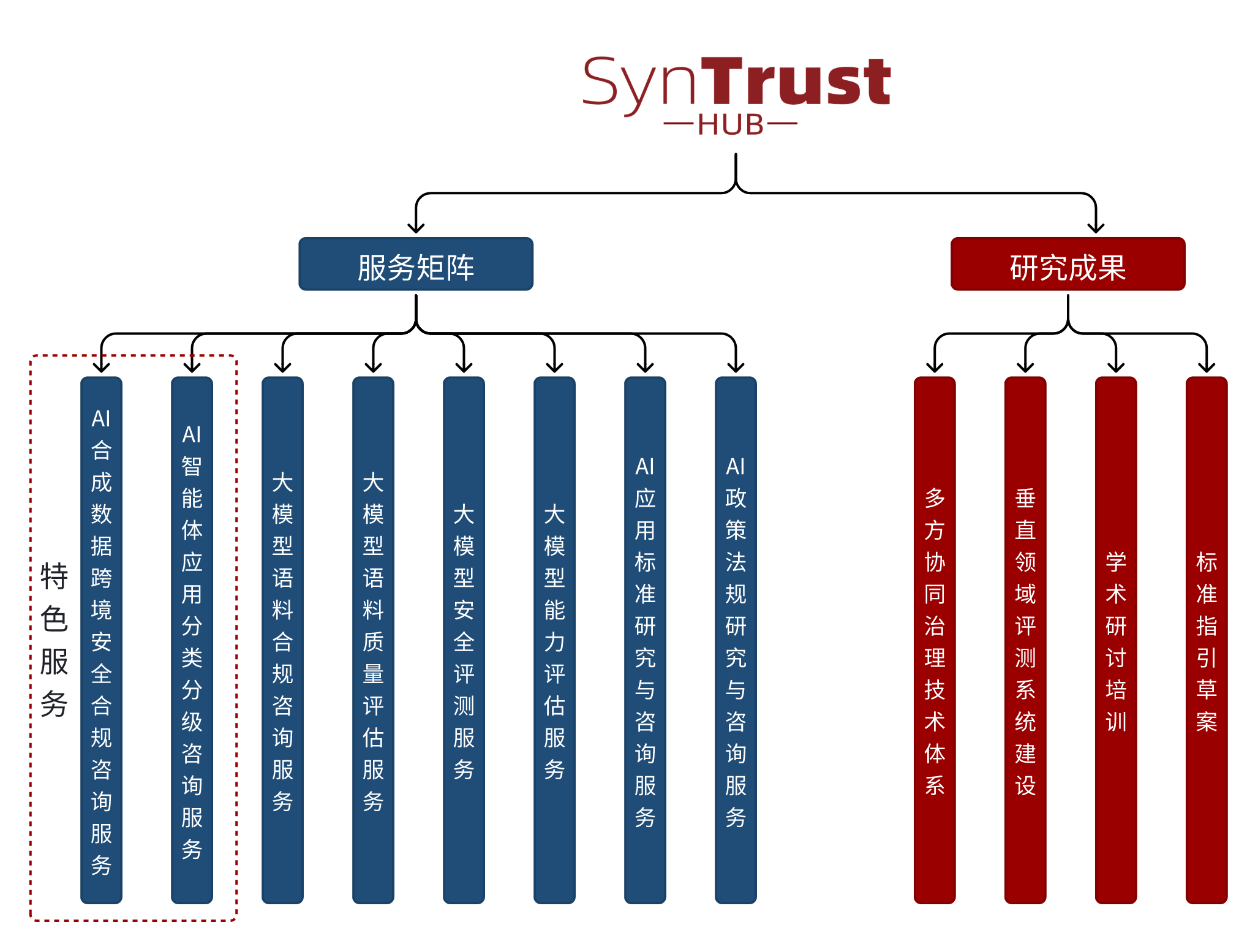 依托临港地区在数据跨境流通与AI应用方面成熟的体系建设及强大的产业集群优势,围绕“AI可信应用”与“跨域AI流通”开展两项特色服务与六项通用服务,形成完整服务矩阵,并开展相关课题研究,推动可信人工智能的持续发展。