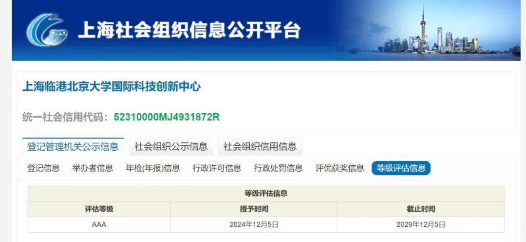 12月5日,根据上海市民政局公告(2024 年第 40 号),上海临港北京大学国际科技创新中心(下称“北大临港科创中心”或“中心”)正式获得上海市社会组织等级评估AAA资质。