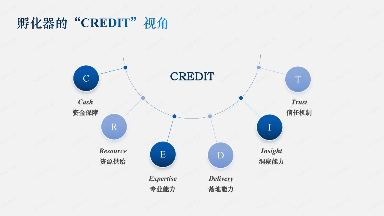 为更好地集聚创新资源、促进科技成果转化、深度服务硬科技企业,加快发展未来产业,促进培育新质生产力,推动经济高质量发展,燕缘孵化器提出“CREDIT”视角,并以此识别整合高水平科创孵化器的关键要素: