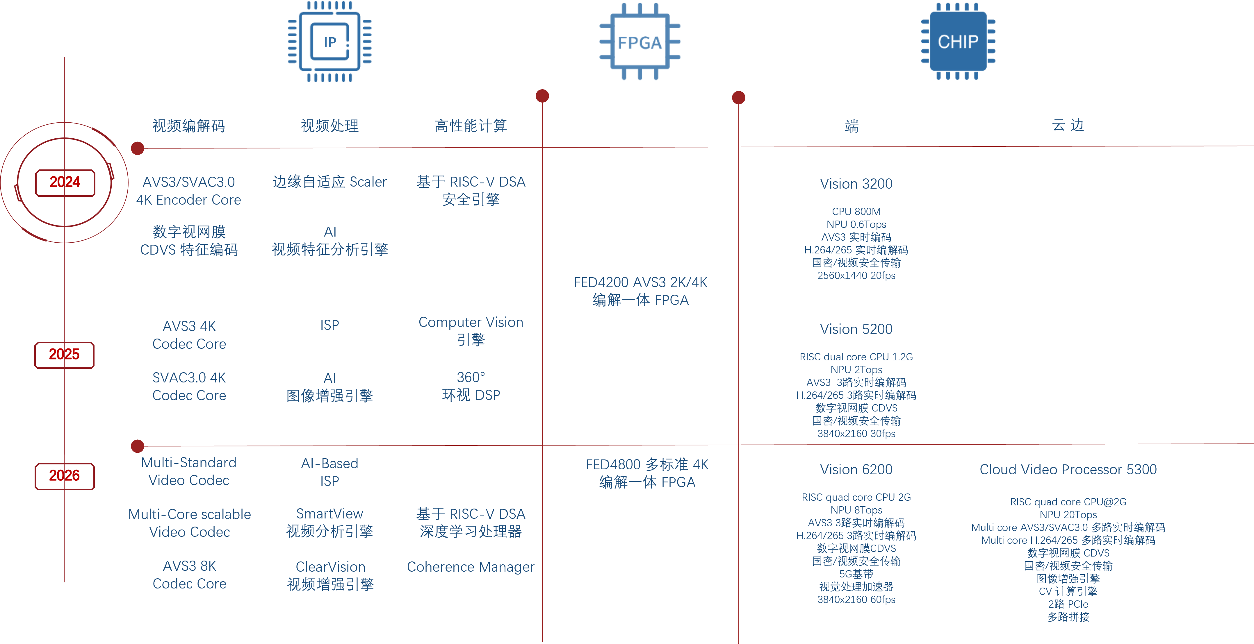 视觉智算系列芯片,作为高性能处理器、音视频编码、安全引擎、AI高性能计算、视频处理各功能IP的组合,具有前瞻的设计理念与自主可控的核心技术,具备高效的视频压缩能力、智能体高并发可信互联能力、支持算力共享。